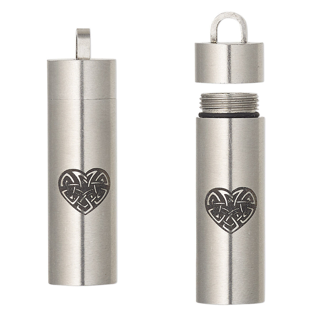 Pendant, silicone and stainless steel, black, 40x11mm cylinder with laser-etched Celtic heart design and twist-off top. Sold individually. Chain not included.