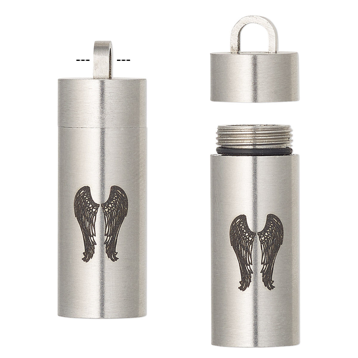 Pendant, silicone and stainless steel, black, 35x11mm cylinder with laser-etched wings design and twist-off top. Sold individually. Chain not included.