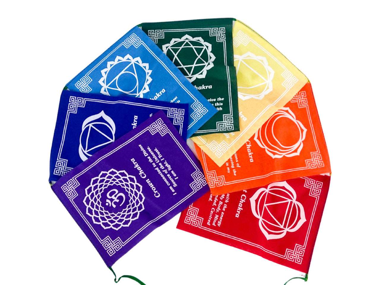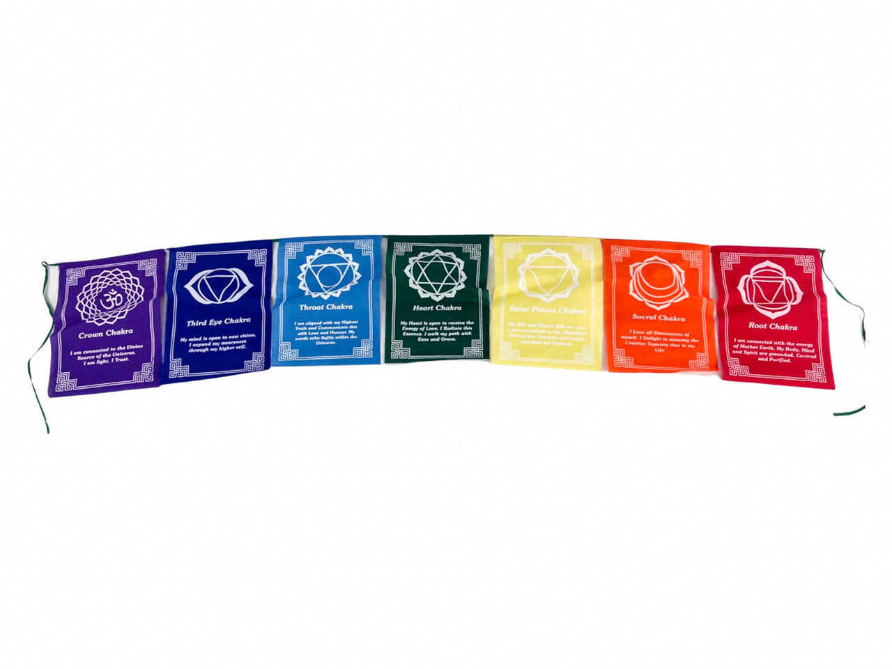 This set of 7-chakra prayer flags includes 7 flags along a string, one for each chakra. Each flag is the color of the chakra displayed on that flag, with the Chakra symbol followed by a chakra-specific saying.