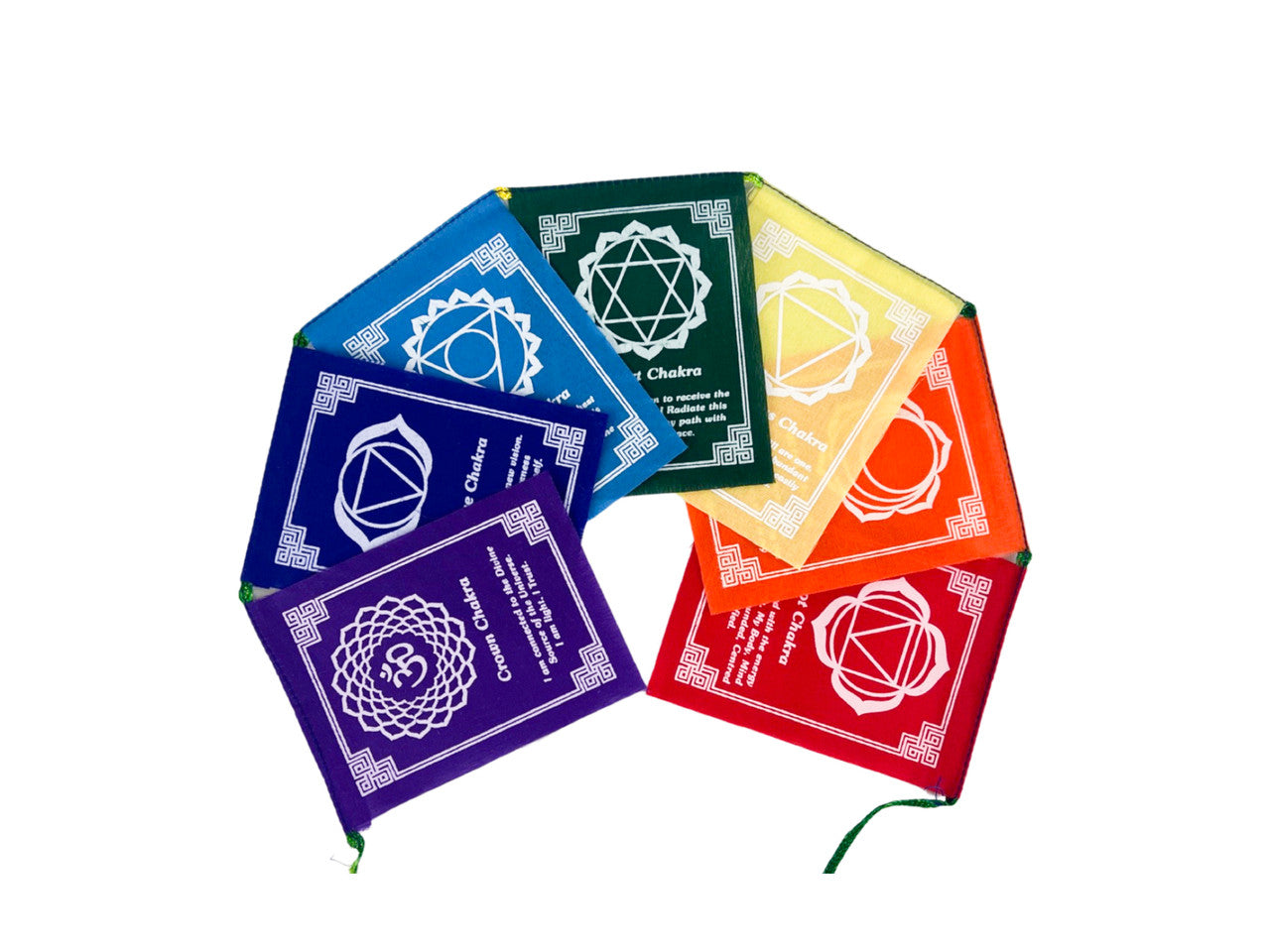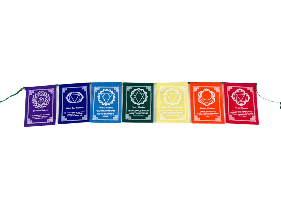 This set of 7-chakra prayer flags includes 7 flags along a string, one for each chakra. Each flag is the color of the chakra displayed on that flag, with the Chakra symbol followed by a chakra-specific saying.