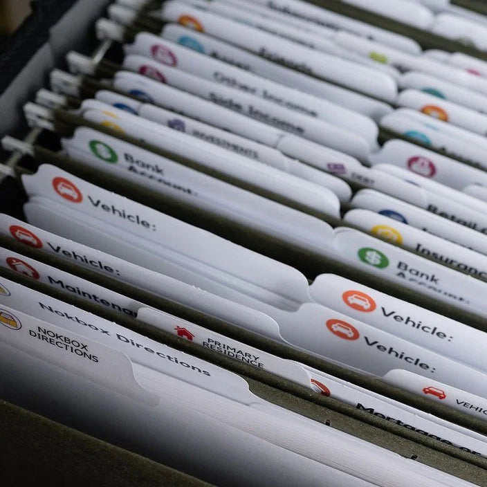 15 color-coded, labeled hanging folders to organize the categories of your Nokbox