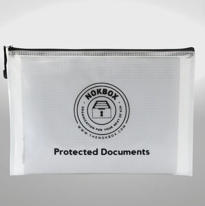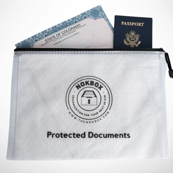 1 zippered Document Protector bag. This bag is for items that belong in your safe or somewhere secure, like passports and birth certificates. The NOK will use this bag to collect other important items they need to keep secure while managing your estate. We give you directions on what to do with this bag.
