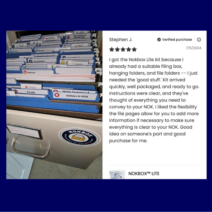 For your NOK, it provides a brief "getting started after someone dies" list, explains how to use the box, and helps them manage keys & secure documents.