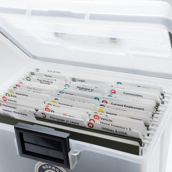 15 color-coded, labeled hanging folders to organize the categories of your Nokbox